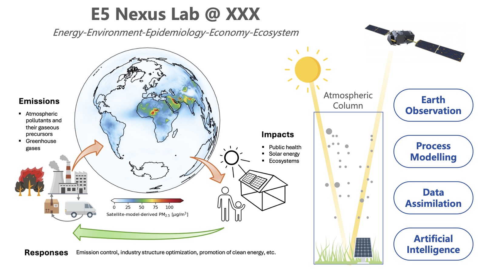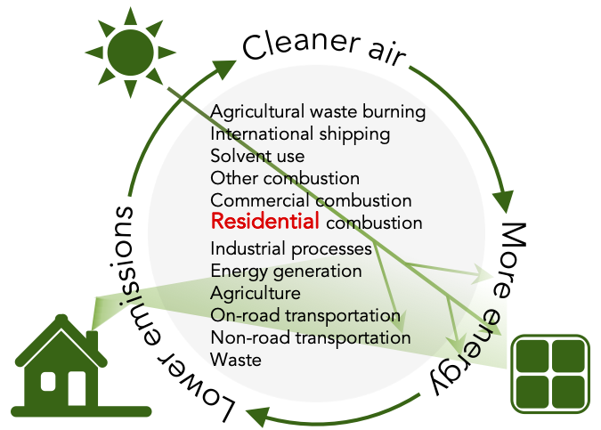 As illustrated in the figure below, our research addresses a conceptual system in which natural and anthropogenic activities generate emissions of air pollutants and greenhouse gases. These constituents are transported and transformed in the atmosphere, ultimately influencing solar energy generation, public health, and ecosystem health, among other impacts. In response to these environmental effects, policy interventions are implemented, which in turn can modify emissions. Our research examines this conceptual system as a whole, while also investigating its individual components.